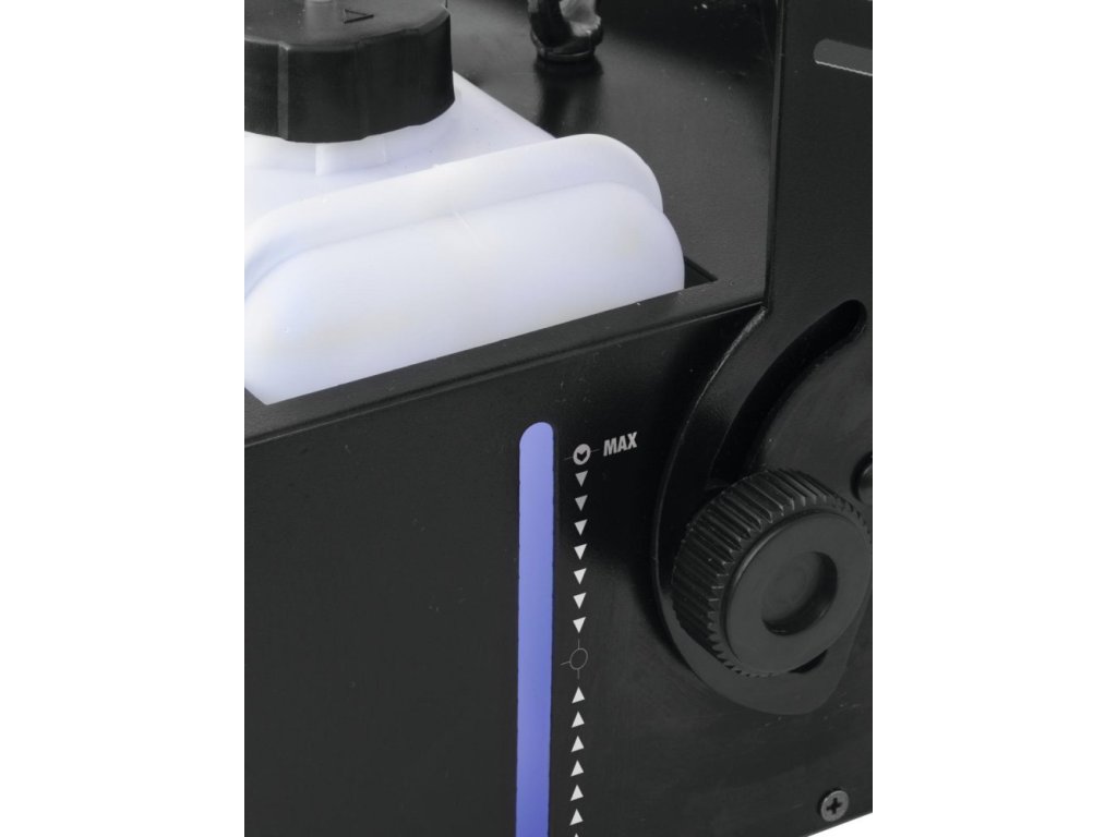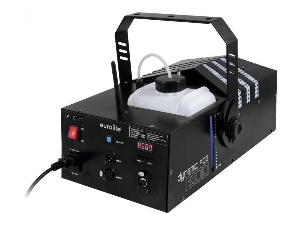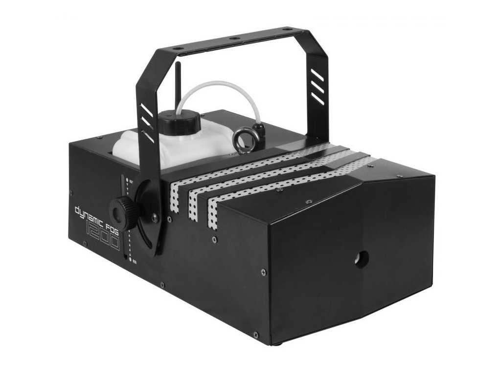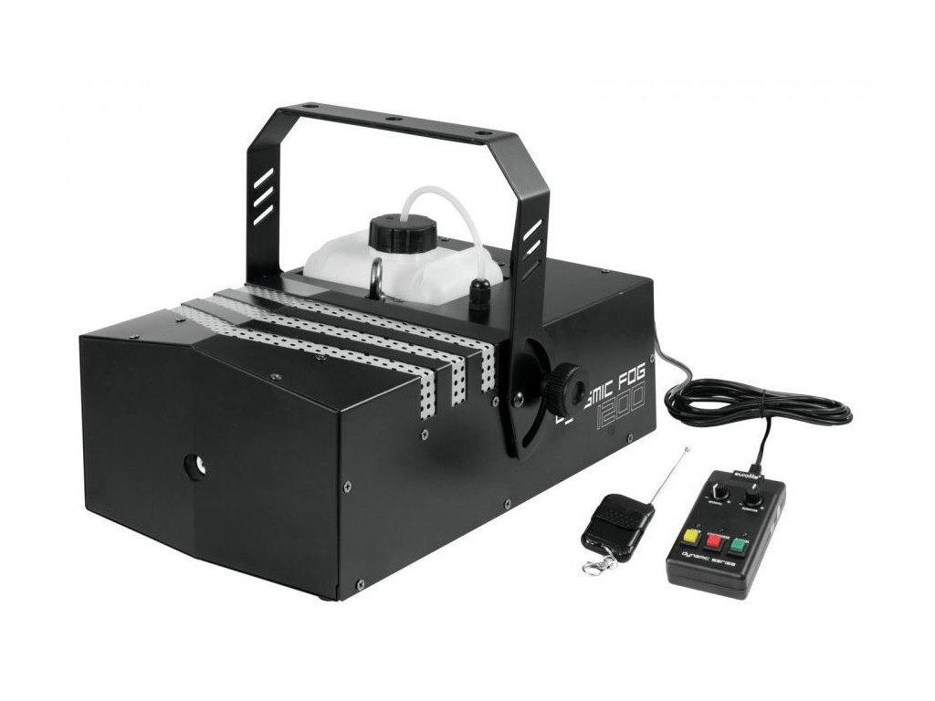 Designerska i wysokowydajna wytwornica mgły Dynamic Fog 1200, najmocniejsza z serii Dynamic. Sterowanie wytwornicą jest możliwe za pomocą DMX (3pin), sterownika bezprzewodowego lub klasycznego sterownika kablowego (w zestawie znajduje się sterowanie kablowe i bezprzewodowe). Za pomocą timera można ustawić czas i liczbę powtórzeń cyklu wytwarzania mgły. Designerskie, kompaktowe kratki wentylacyjne są podświetlone niebieskimi diodami LED (z możliwością wyłączenia). Wyjmowany zbiornik, metalowa obudowa z uchwytem i oczkiem zabezpieczającym na linkę zabezpieczającą to już prawie standard. Odpowiednie do stosowania z płynami na bazie wody.