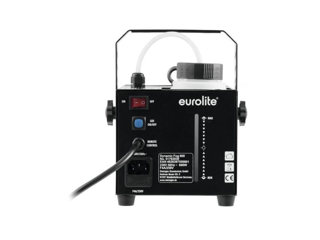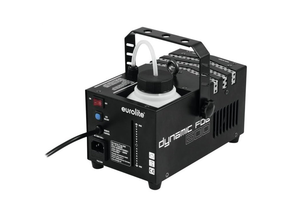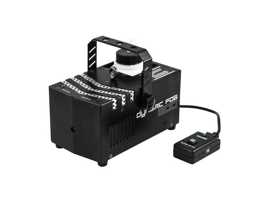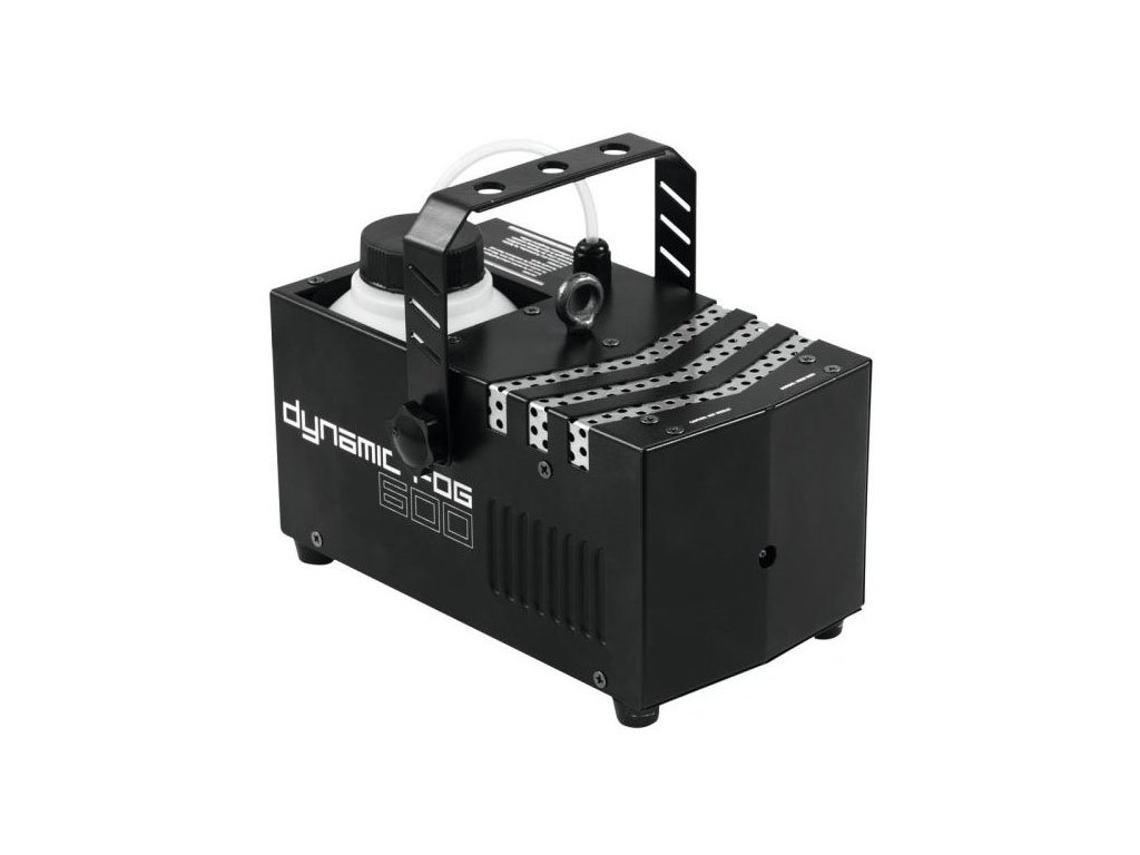 Stylowa, kompaktowa, a jednocześnie wydajna wytwornica mgły Dynamic Fog 600. Sterowanie wytwornicą możliwe jest tylko za pomocą przycisku na sterowniku kablowym (w zestawie), nie można sterować za pomocą DMX. Temperatura cieczy regulowana jest termostatem, błyskawicznie gotowa do wyrzutu mgły (tylko 100 sekund). Designerskie, kompaktowe kratki wentylacyjne są podświetlone niebieskimi diodami LED (z możliwością wyłączenia). Wyjmowany zbiornik, metalowa obudowa z uchwytem i oczkiem zabezpieczającym na linkę zabezpieczającą to już prawie standard. Do użytku z płynami na bazie wody.