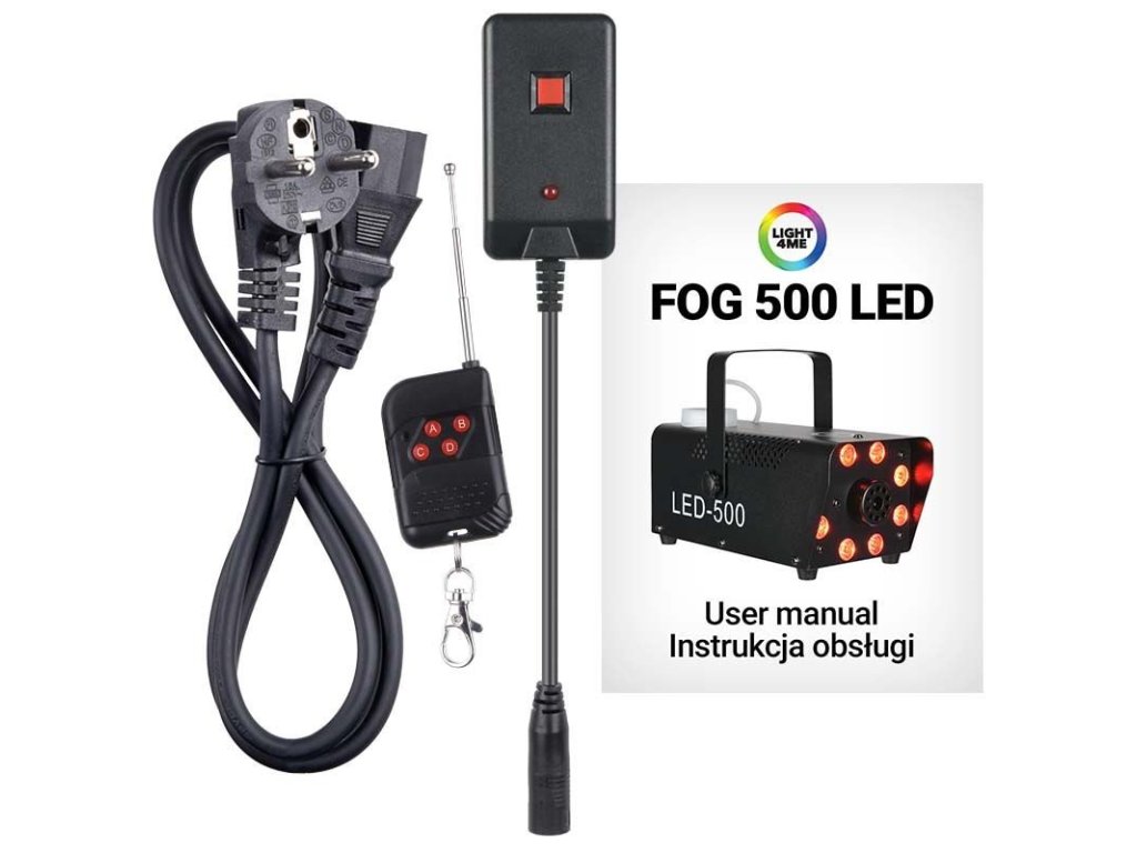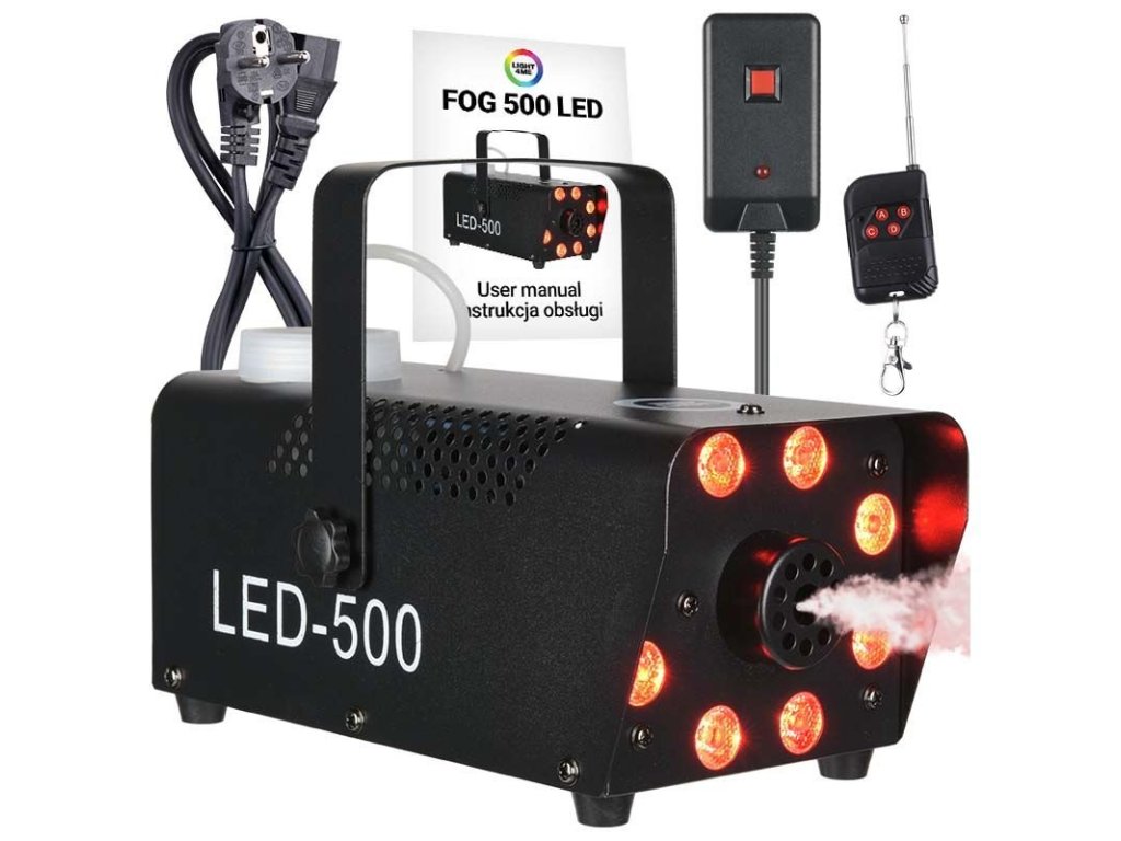 Light4Me Fog 500 LED to lekka, kompaktowa, wysoce mobilna i wydajna wytwornica mgły ze zdalnym sterowaniem bezprzewodowym. Jest wyposażona w 8 diod LED pracujących w palecie RGB, które oświetlają wydmuchiwana mgłę. Wytwornica idealnie nadaje się do różnego rodzaju rozrywki, na wieczory, prywatne imprezy, imprezy DJ-skie, ale także do małych klubów tanecznych i dyskotek.