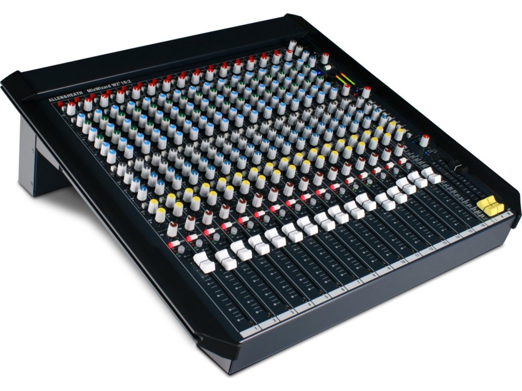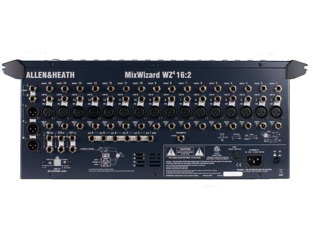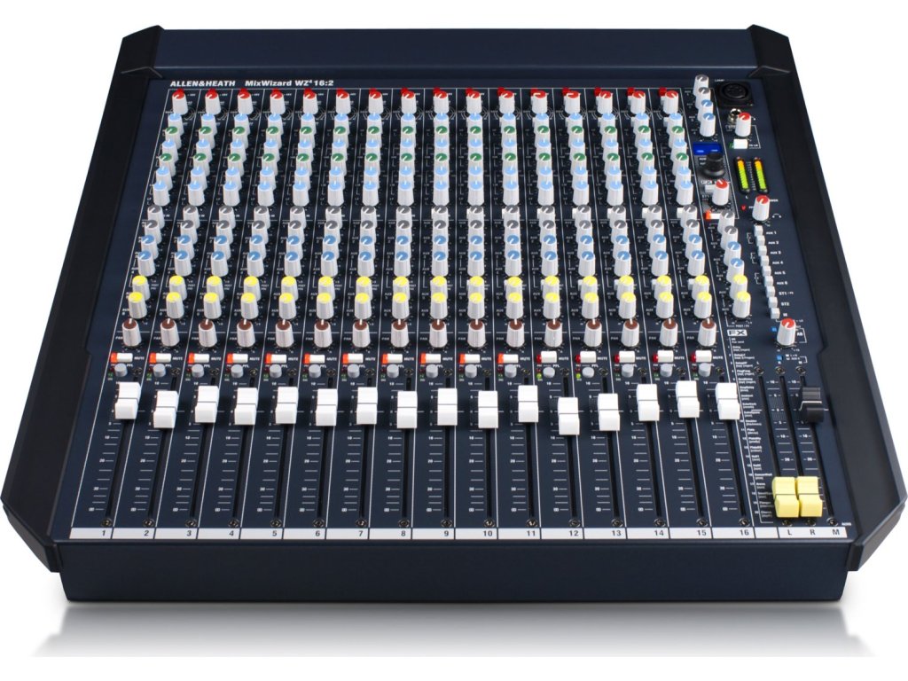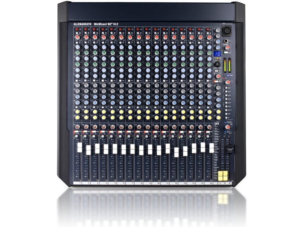 Allen&Heath - WZ4 16:2. Kompaktowa konsola mikserska z 16x wejściami mikrofonowo-liniowymi i insertem. 100mm potencjometry suwakowe, 2x procesory Digitech z 20 efektami w studyjnej jakości. Przełączanie EQ in / out, możliwość montażu w racku i USB multitrack. Mikser ma wymiary: 507 x 530 x 194 (mm) a waga: 13 kg.