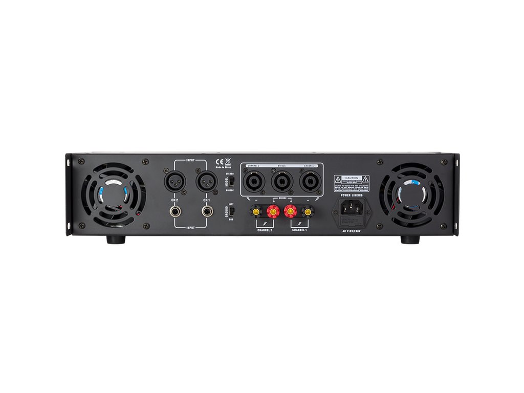 Wzmacniacz ma uniwersalne możliwości podłączenia. Na każdym kanale równolegle połączone są złącza wejściowe (1x XLR, 1x 1/4” Jack TRS). Mogą być używane jako symetryczne lub niesymetryczne wejście lub jako złącza przelotowe przy zasilaniu wielu wzmacniaczy tym samym sygnałem. Wyjścia głośnikowe są wyposażone w złącza Speakon (2x stereo + 1 dedykowane dla trybu Bridge) oraz zaciski śrubowe. Na tylnym panelu znajduje się również przełącznik trybów pracy Stereo/Bridge, przełącznik napięcia w zależności od napięcia w sieci w Twojej okolicy oraz odłącznik uziemienia sygnału, który oddziela płaszcz symetrycznych złączy wejściowych od obudowy wzmacniacza w celu redukcji szumów. Wzmacniacz można również zainstalować w dowolnym 19-calowym racku, a jego elegancka i lekka konstrukcja zapewnia wygodne przenoszenie i transport.