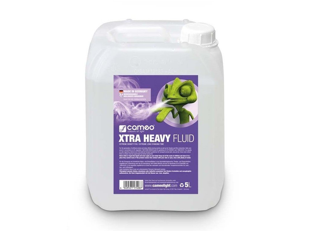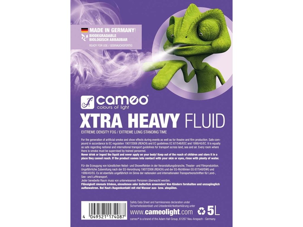 Cameo Xtra-Heavy Fluid wytwarza wyjątkowo gęstą i stabilną białą mgłę o bardzo długim czasie utrzymywania się i doskonałej wydajności odbijania. Został specjalnie stworzony do użytku na zewnątrz i nadaje się do wszystkich standardowych wytwornic mgły. Cameo Xtra-Heavy Fluid jest „produkowany w Niemczech” i podlega stałej kontroli jakości. Jest bezwonny i biodegradowalny.
