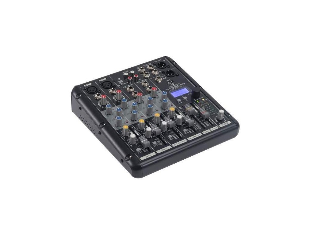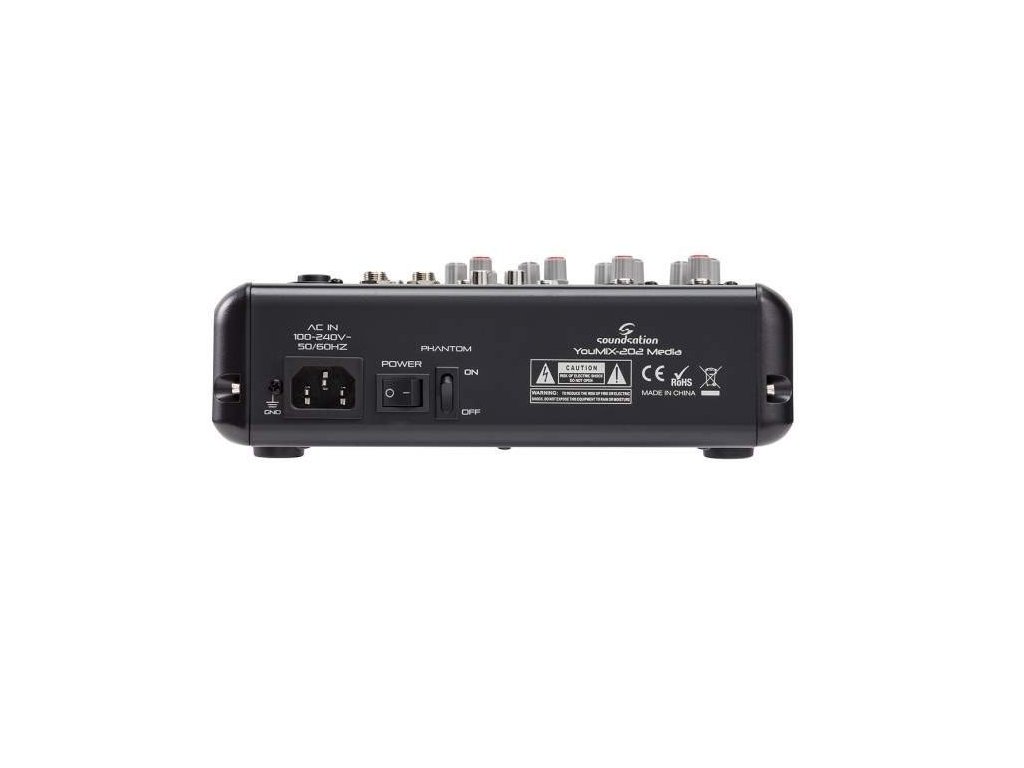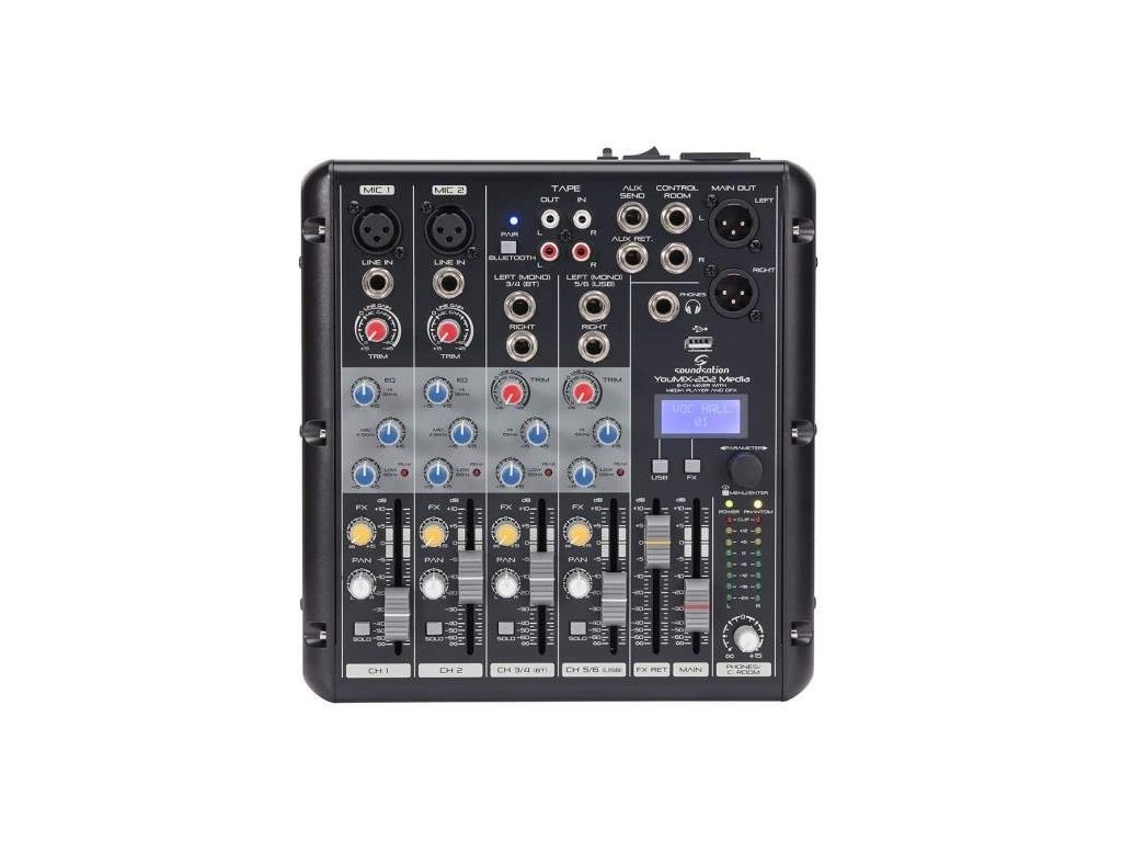 Youmix 202 Media to sześciokanałowy mikser z dwoma wejściami XLR z przedwzmacniaczem mikrofonowym, dwiema parami wejść liniowych, dwoma wyjściami XLR do PA, wyjściem słuchawkowym do szczegółowego monitoringu oraz portem USB do podłączenia odtwarzacza lub dysku Flash. Konsoleta posiada również złącza RCA do podłączenia odtwarzaczy muzycznych i późniejszego połączenia z innym urządzeniem. Funkcję tę docenią przede wszystkim DJ-e i prezenterzy na imprezach firmowych. Sygnał wyjściowy można następnie regulować za pomocą dwu- lub trzypasmowego korektora lub jednego z 256 efektów (Room, Hall, Vocal i Plate reverbs; Delay; Echo; Chorus; Flanger i Combo). Podgląd ustawień uzyskasz za pomocą sześciopoziomowego wskaźnika LED i podświetlanego wyświetlacza. Głośność reguluje się za pomocą 60 mm suwaków na każdym kanale.