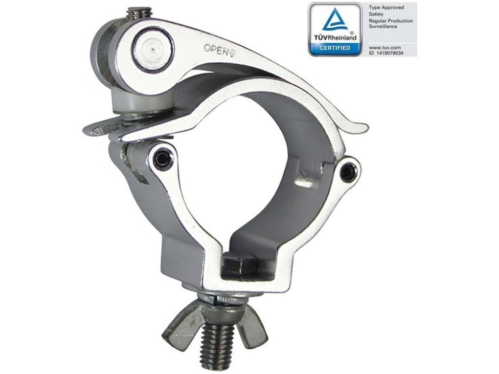 Profesjonalny uchwyt montażowy typu Omega, przeznaczony do szybkiego montażu ruchomych głów i cięższych efektów świetlnych na różnych typach konstrukcji kratownicowych systemu bi, tri, quadro. Uchwyt jest przeznaczony do konstrukcji kratownicowych o średnicy rur 48 - 51 mm. Dzięki szybkiej i łatwej w użyciu zapadce uchwyt z przymocowanym urządzeniem można natychmiast zawiesić na konstrukcji - teraz możesz bez obaw poświęcić się przygotowaniu instalacji, ponieważ urządzenie już bezpiecznie spoczywa na konstrukcji, a nie na ramionach lub w rękach osoby, która przy innych typach montaży musi podtrzymywać całe wyposażenie.