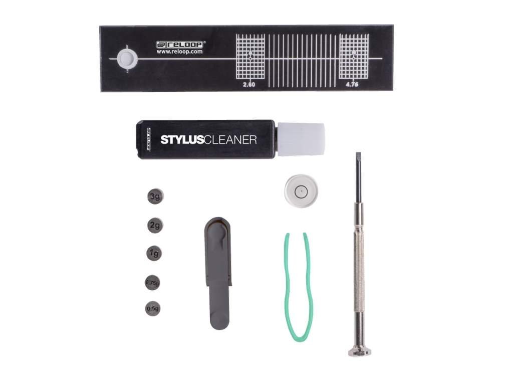 - Zawartość opakowania: Linijka wyrównująca, 5x ciężarki wyważające, miernik śledzenia igły, preparat czyszczący, śrubokręt, mała poziomica, pęseta
