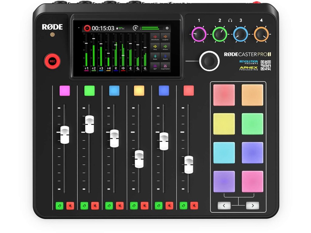 Studyjny mikser podcastowy i streamingowy, 4 analogowe wejścia – mikrofon/linia/instrument, 4x wyjście słuchawkowe, 1x wejście zestawu słuchawkowego, wyjście na monitory audio, 2x USB-C, slot micro SD, Wi-Fi, Ethernet, Bluetooth®, odbiornik dla RØDE wireless, 6 fizycznych faderów, 8 smart padów, dotykowy wyświetlacz LCD, procesory APHEX®, efekty RØDE FX.