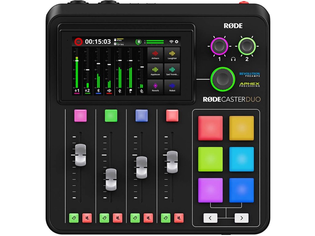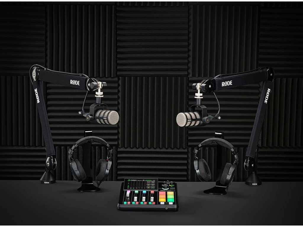 Kompaktowy studyjny mikser do podcastów i streamingu, 2 wejścia analogowe – mikrofon/linia/instrument, 2x wyjście słuchawkowe, 1x wejście zestawu słuchawkowego, wyjście na monitory audio, 2x USB-C, Wi-Fi, Ethernet, Bluetooth, odbiornik dla RØDE wireless, 4 fizyczne i 3 wirtualne fadery, dotykowy wyświetlacz LCD, procesory APHEX, efekty RØDE FX