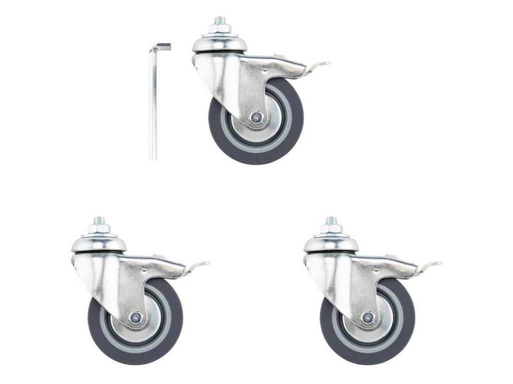 Zestaw trzech kółek z hamulcami i mocowaniem M10, średnica 75 mm.