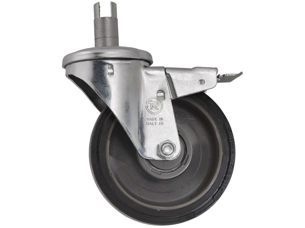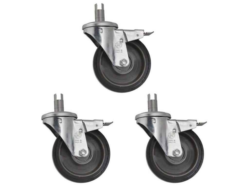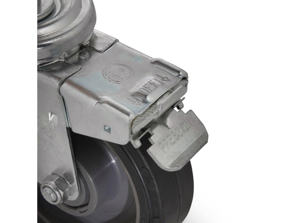 Zestaw trzech kółek do statywów Strato Safe Stands jest dostarczany z podwójnym mechanizmem hamulcowym, który potrafi zablokować kółko i czop obrotowy oddzielnie.