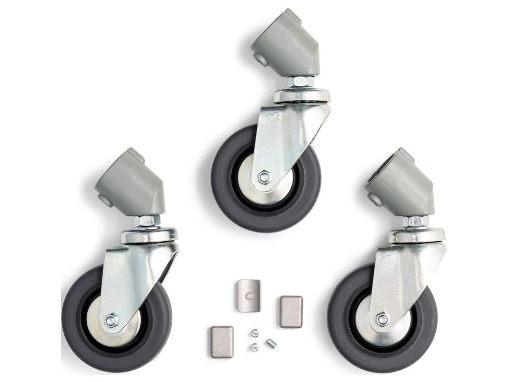 Zestaw trzech kół bez hamulców i adaptera na nogi o średnicy 22 mm, mogą unieść maksymalnie 60 kg.