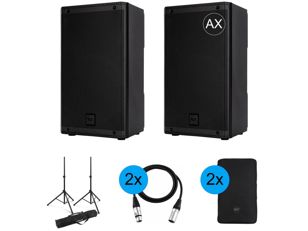 Korzystny zestaw 2 szt. aktywnych kolumn głośnikowych RCF ART 910-A + ART 910-AX, 2 szt. oryginalnych pokrowców na kolumny głośnikowe RCF, 2 szt. kabli połączeniowych Vonyx CX310-6 6m oraz zestawu statywów z pokrowcem transportowym Vonyx LS01K.