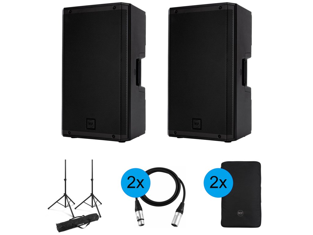 Korzystny zestaw 2 szt. aktywnych kolumn głośnikowych RCF ART 912-A, 2 szt. oryginalnych pokrowców na kolumny głośnikowe RCF, 2 szt. kabli połączeniowych Vonyx CX310-6 6m oraz zestawu statywów z pokrowcem transportowym Vonyx LS01K.