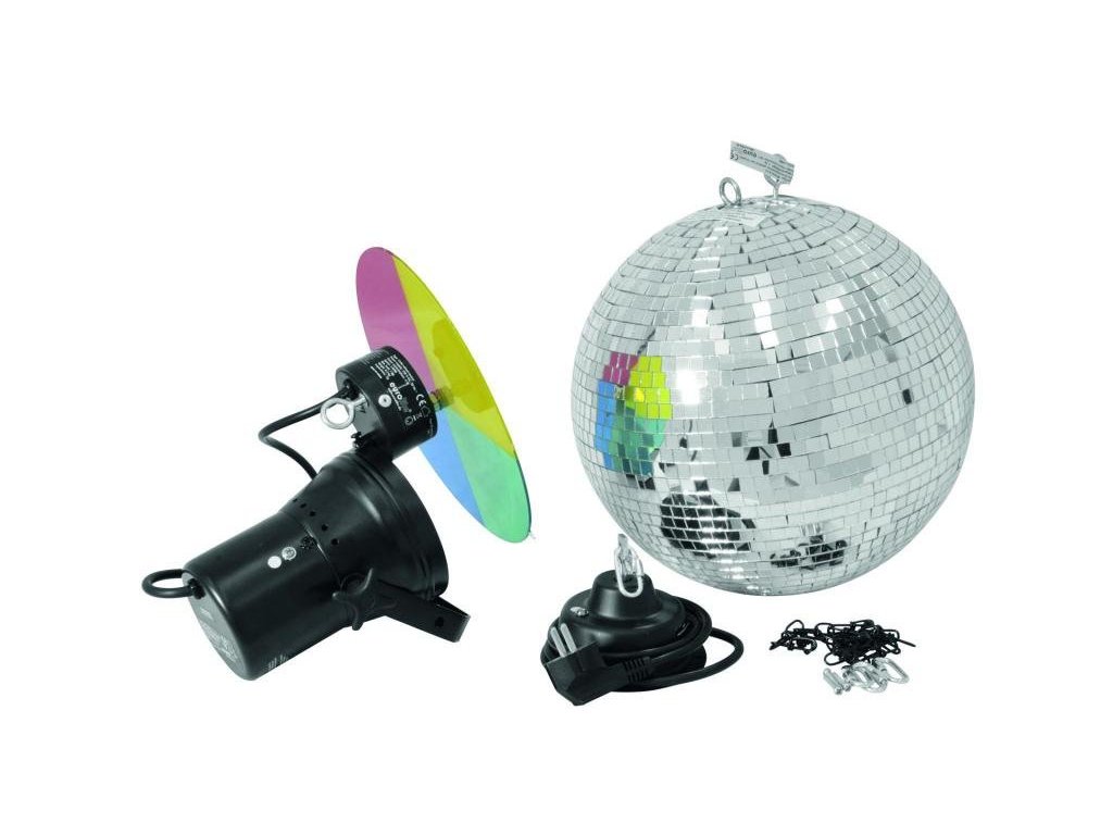 Zestaw zawiera kulę lustrzaną o średnicy 30 cm i motorek 1,5 obrotu / min, łańcuch do mocowania kuli 33 cm, Eurolite PAR 36 T czarny, żarówkę PAR 36, 6V/30W 200h VNSP, obrotowy zmieniacz 4 kolorów, który mocuje się do korpusu reflektora. Wystarczy tylko rozpakować i można zacząć instalować. Idealny nowoczesny prezent.