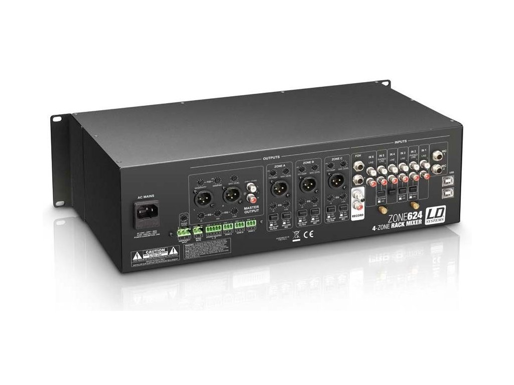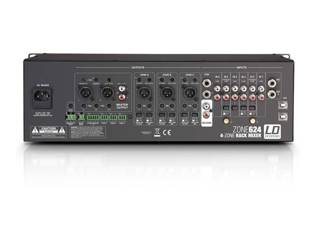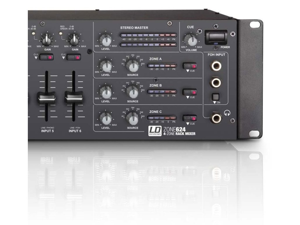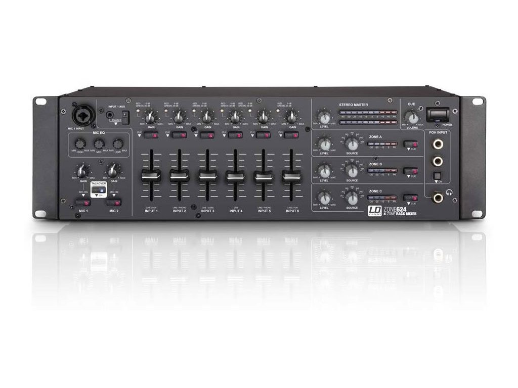 ZONE 624 to w pełni wyposażony mikser strefowy z 6 kanałami liniowymi i 2 mikrofonowymi, które można przypisać do stereofonicznego lub monofonicznego wyjścia master. Kompaktowe urządzenie rackowe 3U posiada również wejścia dla zewnętrznego systemu powiadomień alarmowych i zdalnie sterowane wyciszenie przełączania. Dzięki rozbudowanej łączności ZONE 624 jest niezwykle elastycznym rozwiązaniem centrum sterowania dla systemów PA w sklepach spożywczych, klubach, hotelach, centrach fitness i wielu innych obszarach.