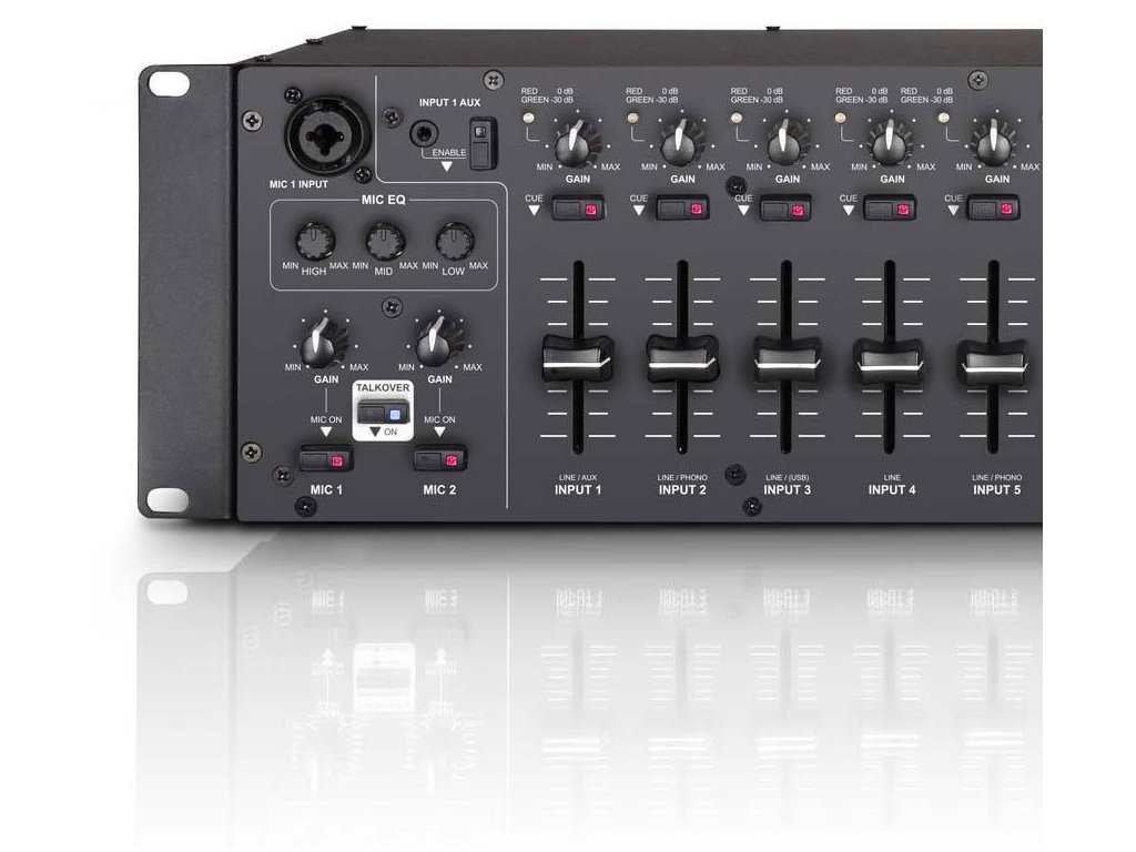 - Kanały liniowe: 6 (Wejście 1: Aux/Line, Wejście 2 + 5: Linia/Phono, Wejście 3: USB/Linia 4: Linia, Wejście 6: Linia/FOH