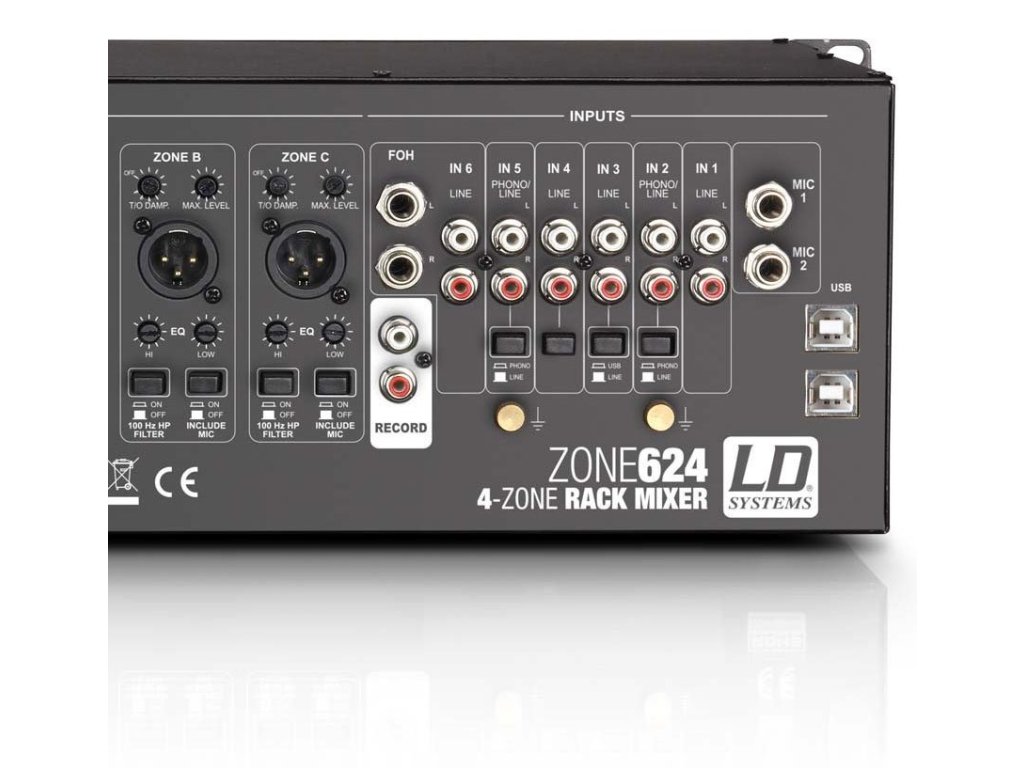 Dwa symetryczne wejścia mikrofonowe mają wspólny 3-pasmowy EQ, zasilanie phantom 12V i funkcję Talkover; tłumienie Talkover można indywidualnie ustawić dla wszystkich wyjść strefowych z tyłu urządzenia. 6 stereofonicznych kanałów wejściowych ZONE 624 jest wyposażonych w regulację wzmocnienia, diody LED sygnałowe i szczytowe, fadery 45 mm, przyciski Cue i złącza RCA; kanał 6, dodatkowo z symetrycznymi wejściami TRS dla sygnałów FOH. Urządzenie posiada również przełączalne wejście Aux przez mini jack 3,5 mm oraz port USB, który jest używany jako stereofoniczne wejście i wyjście (nagrywanie) i przekształca ZONE 624 w zewnętrzny interfejs audio.
