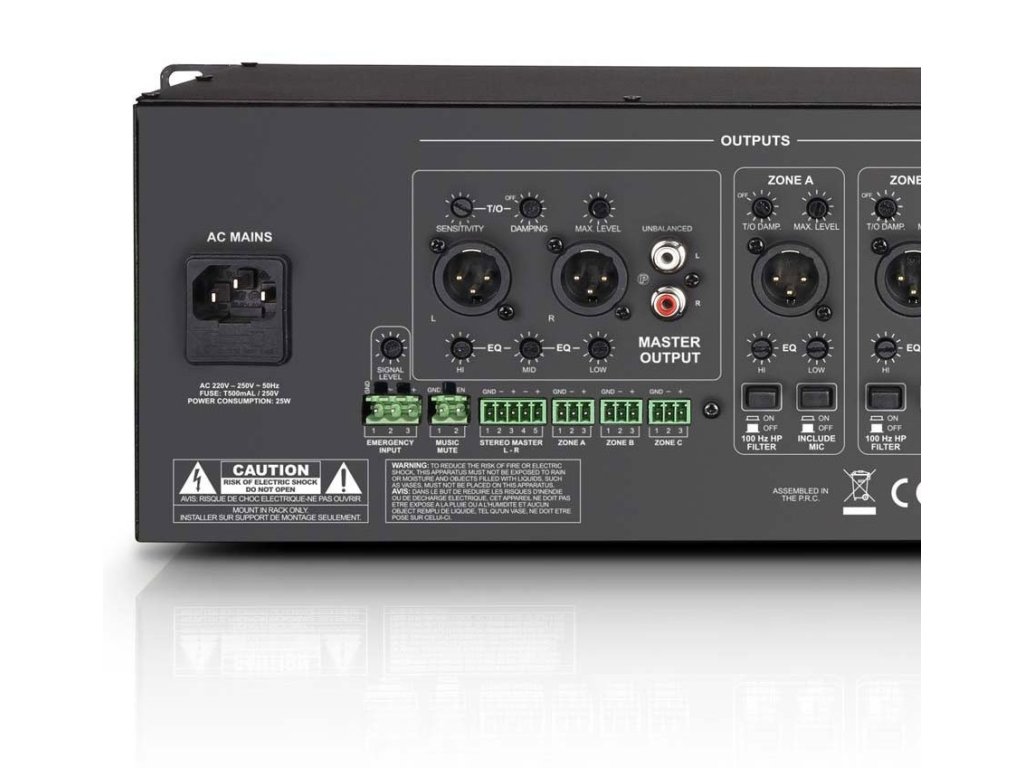 - Wyjścia liniowe: 5 (Master – Stereo, 3x strefa – Mono, Rec – Stereo)