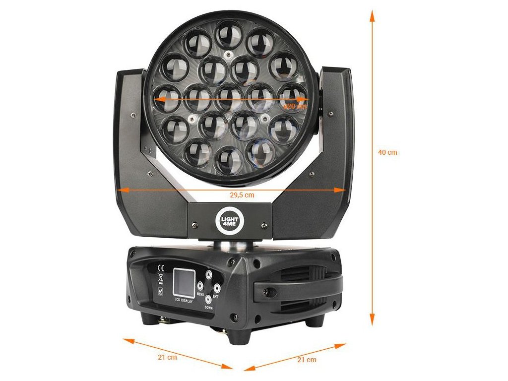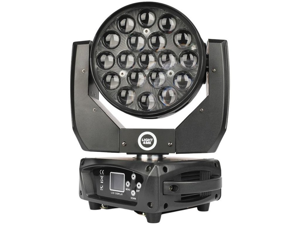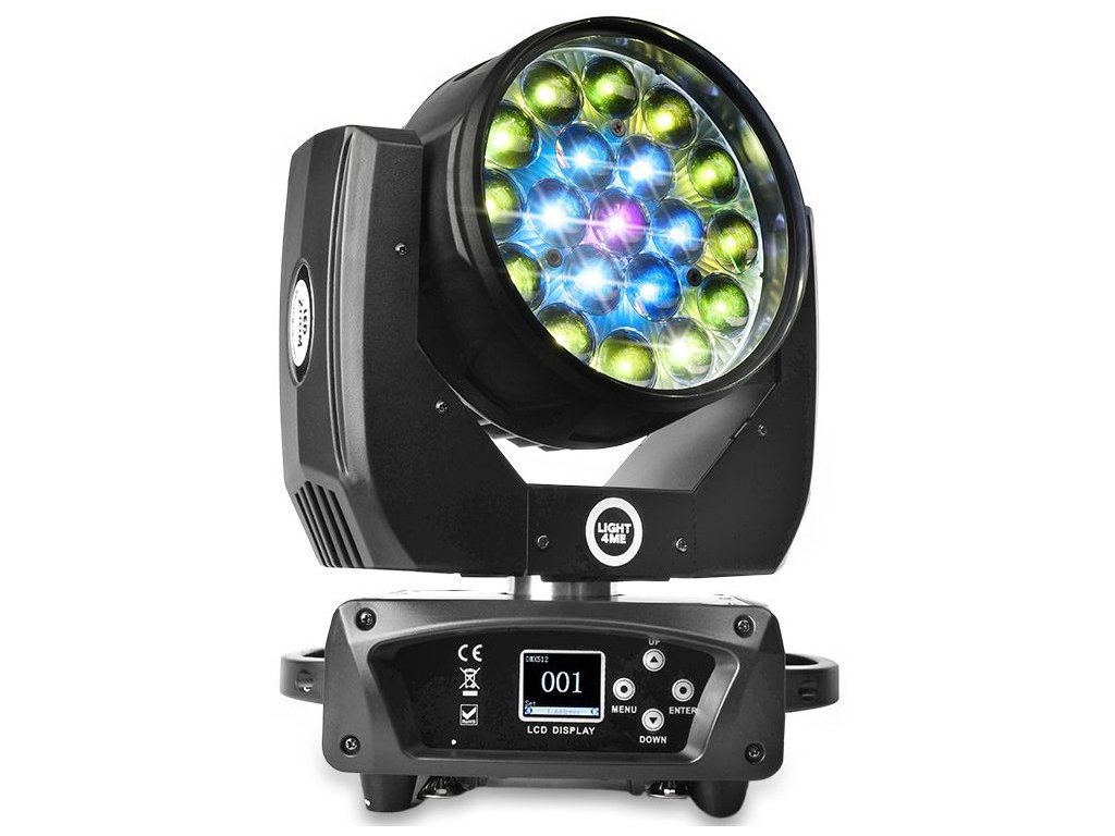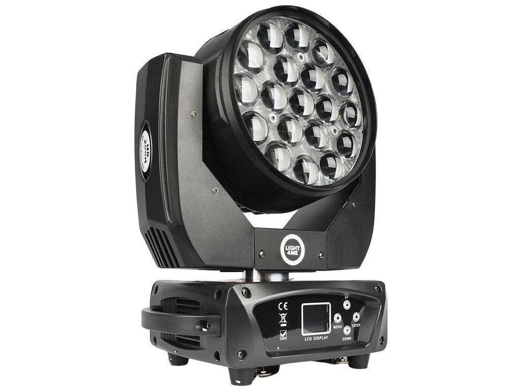 Light4Me Zoom Wash 19x15W to nowoczesna, w pełni profesjonalna ruchoma głowica LED typu wash wyposażona w system mieszania kolorów RGBW i automatyczny zoom. Głowica posiada bardzo wydajny moduł LED o łącznej mocy do 400 W, dzięki czemu idealnie nadaje się na sceny koncertowe i teatralne, do studiów telewizyjnych i scen filmowych. To także świetna głowica LED typu wash dla mobilnych DJ-ów, zespołów, firm eventowych oraz klubów muzycznych i dyskotek, która umożliwia efektywne oświetlenie parkietu tanecznego i tworzenie niesamowitych efektów wizualnych.