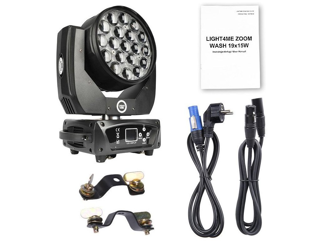 - W zestawie: Zoom wash 19x15W, kabel DMX, kabel zasilający, uchwyty montażowe, krótka instrukcja